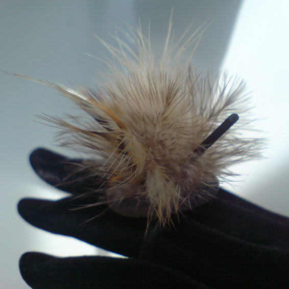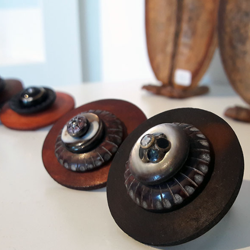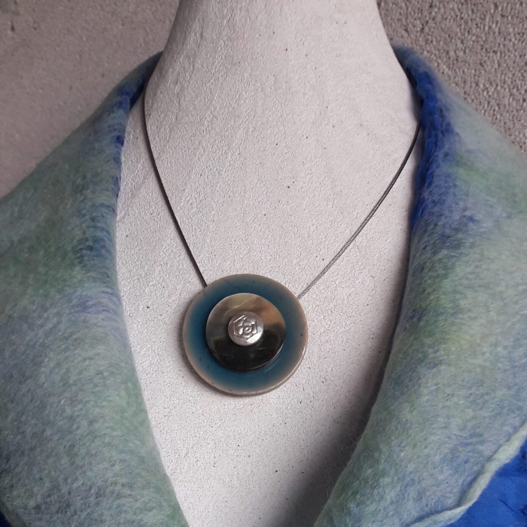J’utilise essentiellement des boutons anciens, mais aussi d’autres neufs en nacre ou en corne que je teins moi-même. J’aime les associer à la céramique, au bois, au cuir ou à la laine feutrée. Chaque pièce est une composition unique, sensible, guidée par la matière et l’émotion.